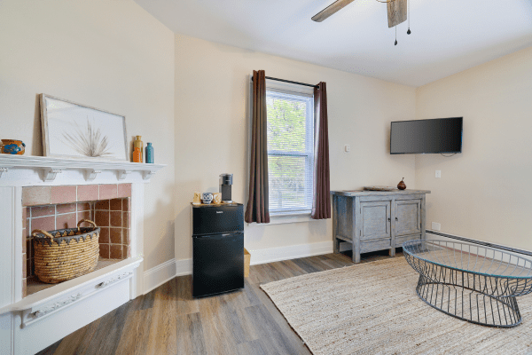 Pen a letter to your friends or family on us with postcards in the room.