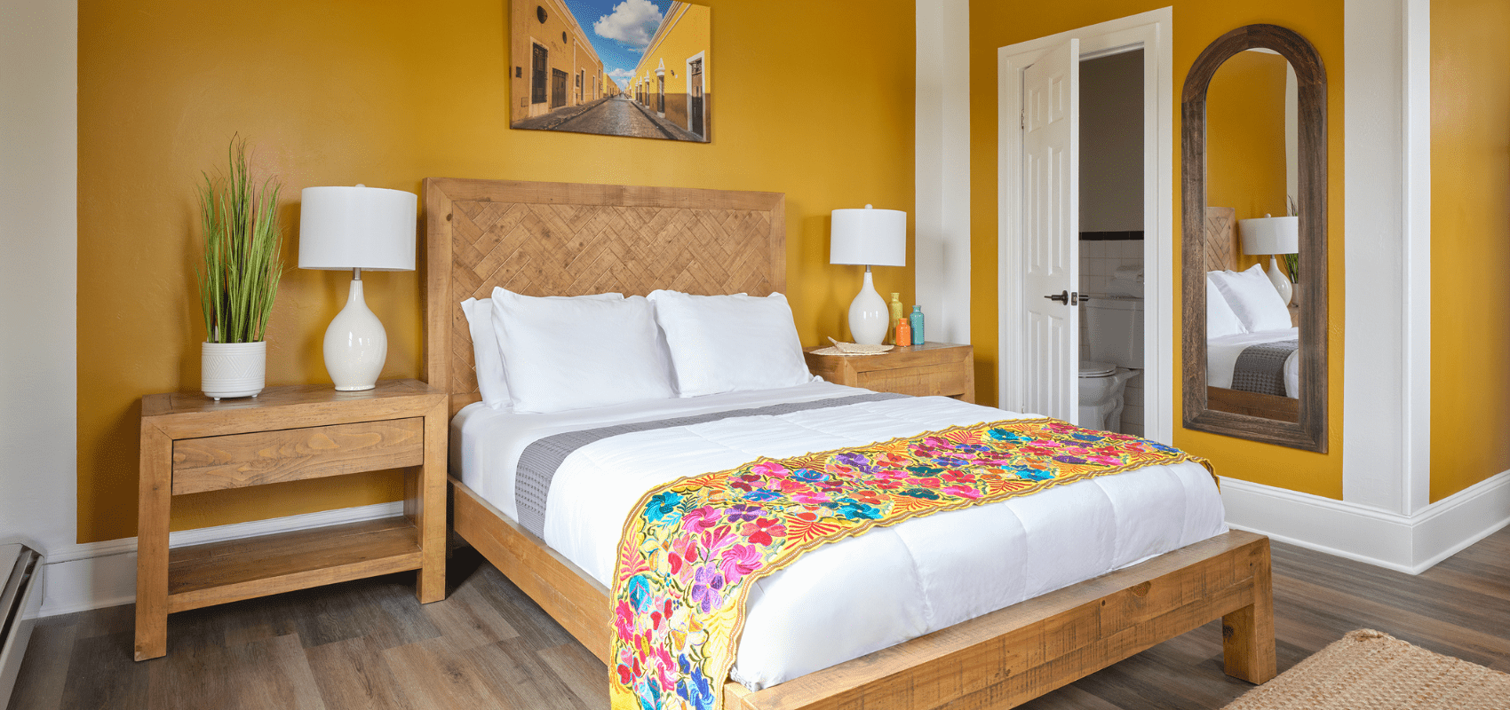 Step into the Izamal Illumination Room, where the golden warmth of the Yellow City comes to life. Inspired by the vibrant yellow walls and colonial charm of Izamal, this room is a sanctuary bathed in soft, golden light. Every detail has been thoughtfully designed to capture the energy and spirit of this sacred city, creating a space that feels both timeless and serene.